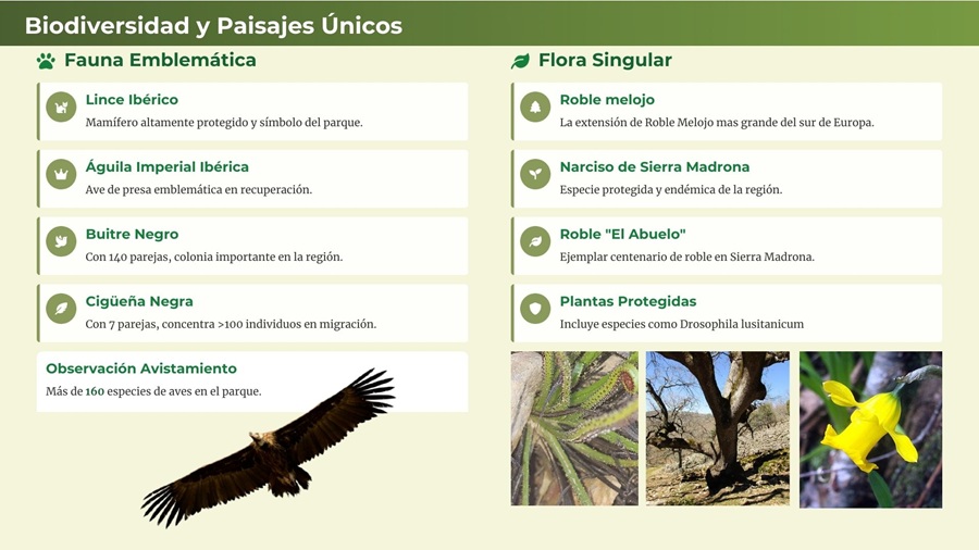 El Valle de Alcudia, con sus amplias llanuras de pastizales y encinares, constituye uno de los paisajes ganaderos más emblemáticos de España, donde priman las dehesas, pastos y caminos trashumantes y mientras que la Sierra Madrona ofrece un entorno montañoso de gran biodiversidad, refugio de especies tan emblemáticas como el lince ibérico, el águila imperial ibérica o el buitre negro. Todo ello convierte al parque en un enclave excepcional para el senderismo, la fotografía de naturaleza, la observación de aves y el turismo científico.