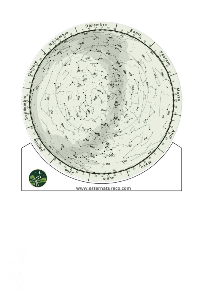 El planisferio celeste es un mapa móvil del cielo que muestra las estrellas y constelaciones visibles desde una latitud determinada, en una fecha y hora concretas.